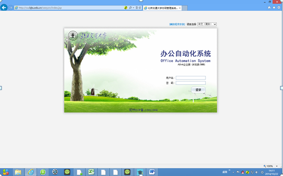 1、  IE浏览器输入网址http://oa.bjtu.edu.cn打开办公自动化系统,如图1所示(注:因为仅支持IE内核,请不要使用非IE内核的浏览器)
