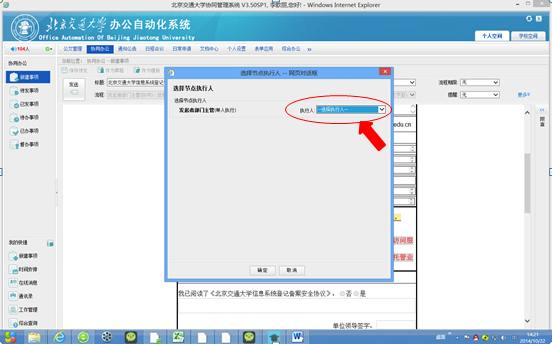 4、  填入表内需要的相关信息,然后点击图3 中标识的“发送”按钮,进入如图4所示的页面,选择所在单位的部门主管进行审批,点击“确定“按钮,则发起人申请过程完毕。
