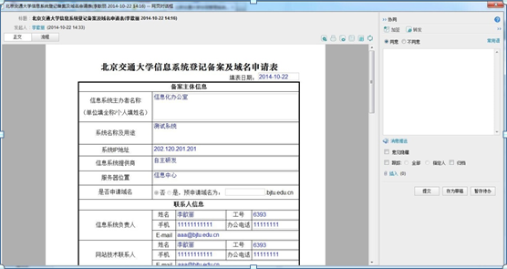 3、  打开 “北京交通大学信息系统登记备案及域名申请表”,进入图3所示页面,