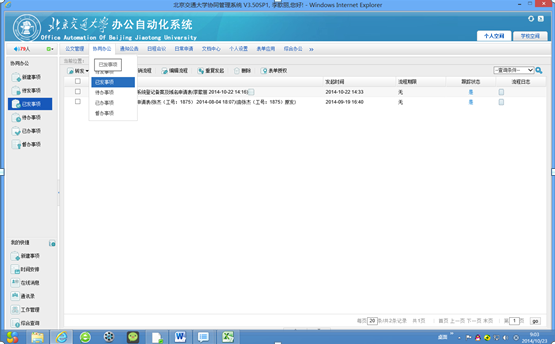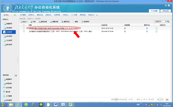1、发起人在办公自动化系统的“协同办公/已发事项”模块找到已处理的申请表,如图8、图9所示。